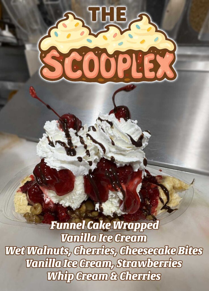 Scooplex’s Grappler is funnel cake wrapped ice cream of your choice, topped with a sauce and a topping.. with 2 more scoops on top! Here are some Signature Grapplers we enjoy!